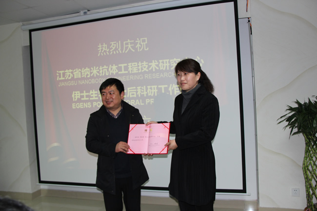 2014年3月20日,南通市伊士生物技術(shù)有限責(zé)任公司在伊士生物研究院會(huì)議室舉行了“江蘇省納米抗體工程技術(shù)研究中心、伊士生物博士后研究工作站揭牌儀式”。南通市科技局條件處 劉宏斌副處長,開發(fā)區(qū)經(jīng)貿(mào)局周愛群副局長,科技處程李榮處長,東南大學(xué)生命科學(xué)研究萬亞坤教授,南通大學(xué)吳啟運(yùn)教授,河南科技學(xué)院李桂榮副教授出席了這次揭牌儀式。 會(huì)議伊始,伊士生物公司董事長歐衛(wèi)軍先生向到場(chǎng)嘉賓分別介紹了伊士生物公司、納米抗體技術(shù)和研發(fā)中心,隨后分別向萬亞坤教授、吳啟運(yùn)教授、李桂榮副教授頒發(fā)了聘書。