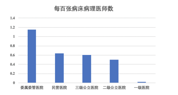 如上圖所示,其中委屬委管醫(yī)院每百?gòu)埐〈膊±磲t(yī)師數(shù)僅為1.15,三級(jí)公立醫(yī)院、二級(jí)公立醫(yī)院和民營(yíng)醫(yī)院分別為0.60、0.50及0.64。根據(jù)最新發(fā)布的《2019年全國(guó)病理質(zhì)量報(bào)告》顯示,在不同級(jí)別的醫(yī)院中,全國(guó)平均每百?gòu)埐〈膊±磲t(yī)師數(shù)量為0.55,病理醫(yī)師數(shù)量奇缺的狀況沒(méi)有改善,各省、自治區(qū)、直轄市均未達(dá)到2009年《病理科建設(shè)與管理指南(試行)》(以下簡(jiǎn)稱《指南》)的最低要求(每百?gòu)埓?-2名病理醫(yī)師)。